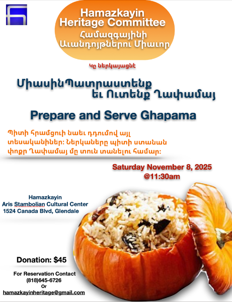 Ghapama Making Workshop November 8, 2025 @ 11:30 am - 2:30 pm Headquarter Offices for the Hamazkayin Cultural Foundation 1524 Cañada Blvd., Glendale, CA