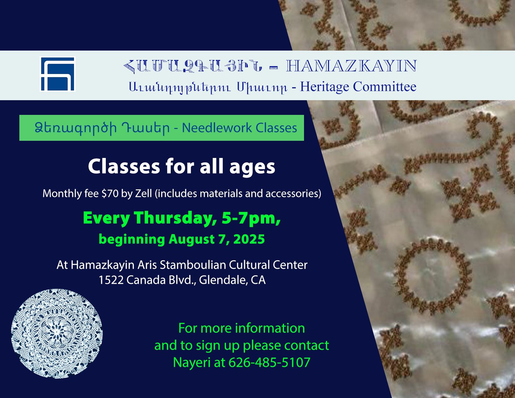 Needlework Classes – Ասեղնագործութիւն September 25, 2025 @ 5:00 pm - 7:00 pm Needlework Classes – Ասեղնագործութիւն Headquarter Offices for the Hamazkayin Cultural Foundation 1524 Cañada Blvd., Glendale, CA $70
